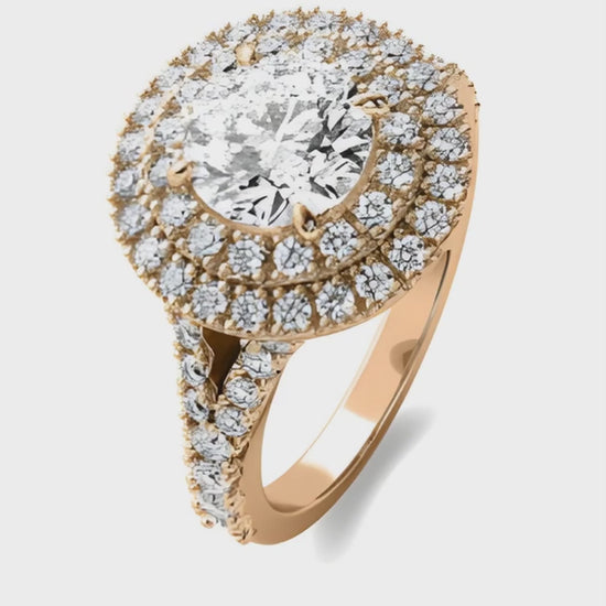 Crafted in rose gold, a fiery center diamond shines within double halos, symbolizing enduring passion. Pavé accents amplify the sparkle for a bold yet refined statement.