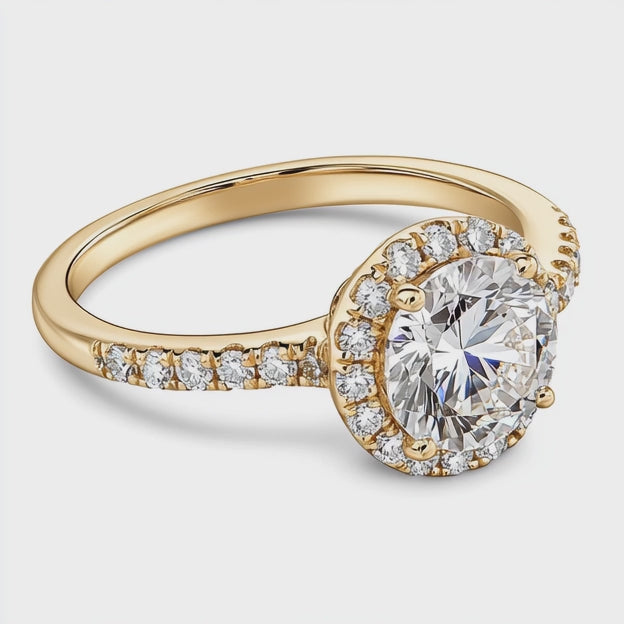 This radiant ring features a round diamond surrounded by a halo of smaller stones. Set in warm yellow gold with a diamond-accented band, it offers vintage charm and brilliance from every angle.